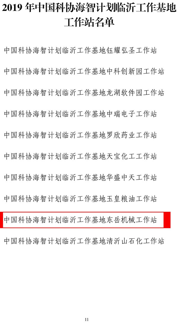 經臨沂市科學技術協(xié)會批準設立東岳機械為中國科學技術協(xié)會“海外智力為國服務行動計劃臨沂基地工作站”(簡稱海智計劃工作基地)。
