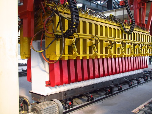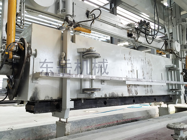 上圖為翻轉(zhuǎn)吊機(jī)組,翻轉(zhuǎn)吊機(jī)組將預(yù)養(yǎng)完成的坯體(帶模具、模具側(cè)板)在空中翻轉(zhuǎn)90°,并繁殖在切割小車上,翻轉(zhuǎn)吊具開鎖器將模具鎖臂開啟,坯體垂直放在側(cè)板上,由切割小車運(yùn)至切割區(qū)進(jìn)行切割。