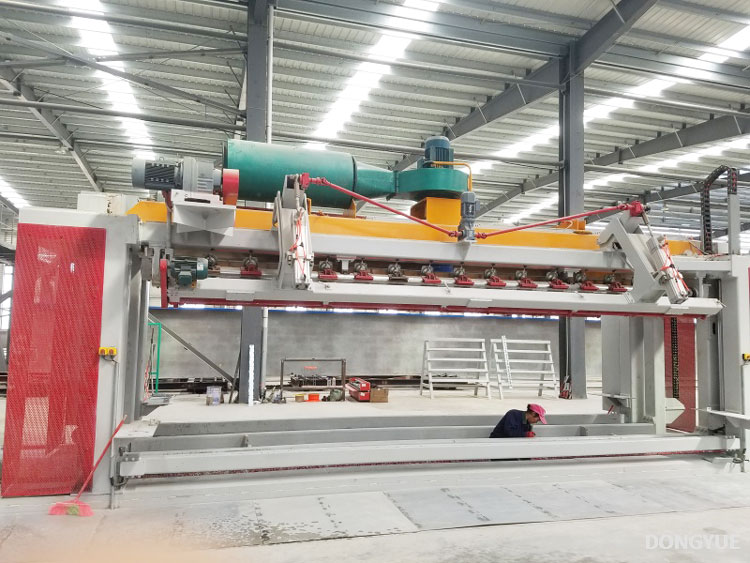 上圖為翻轉(zhuǎn)吊機(jī)組,翻轉(zhuǎn)吊機(jī)組將預(yù)養(yǎng)完成的坯體(帶模具、模具側(cè)板)在空中翻轉(zhuǎn)90°,并繁殖在切割小車上,翻轉(zhuǎn)吊具開鎖器將模具鎖臂開啟,坯體垂直放在側(cè)板上,由切割小車運(yùn)至切割區(qū)進(jìn)行切割。